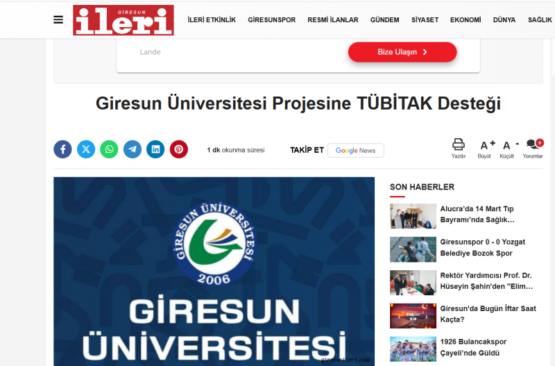 Giresun Üniversitesi Projesine TÜBİTAK Desteği